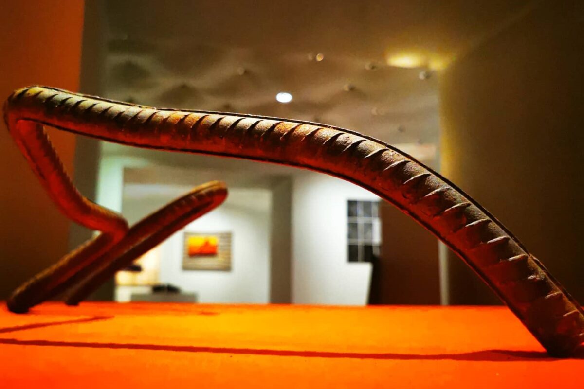 Der Galerieraum zur Rechten wird bestimmt durch eine minimalistische Skulptur aus drei identischen oder, besser, identisch deformierten Eisenstangen. Doch halt!, was wir als Skulptur erkennen – wohl einfach deshalb, weil wir uns in einem Museum befinden – ist etwas anderes.