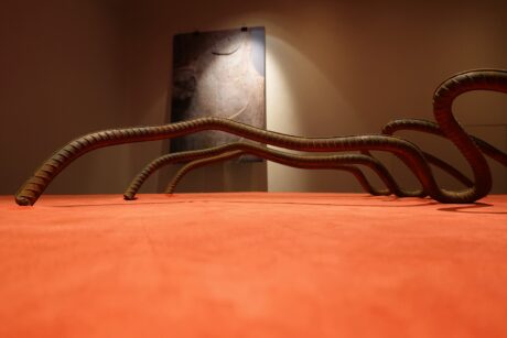 Der Galerieraum zur Rechten wird bestimmt durch eine minimalistische Skulptur aus drei identischen oder, besser, identisch deformierten Eisenstangen. Doch halt!, was wir als Skulptur erkennen – wohl einfach deshalb, weil wir uns in einem Museum befinden – ist etwas anderes.